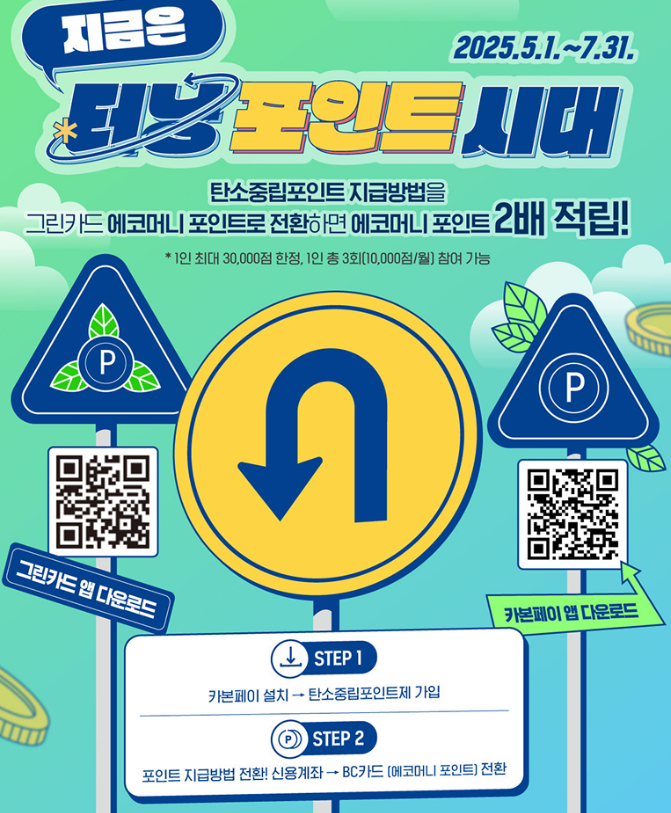탄소중립포인트 지급방법을 그린카드 에코머니 포인트로 전환하면 에코머니 포인트를 2배 적립해드립니다. - 지원내용: 다회용컵 사용, 무공해차 이용 시 포인트 지급